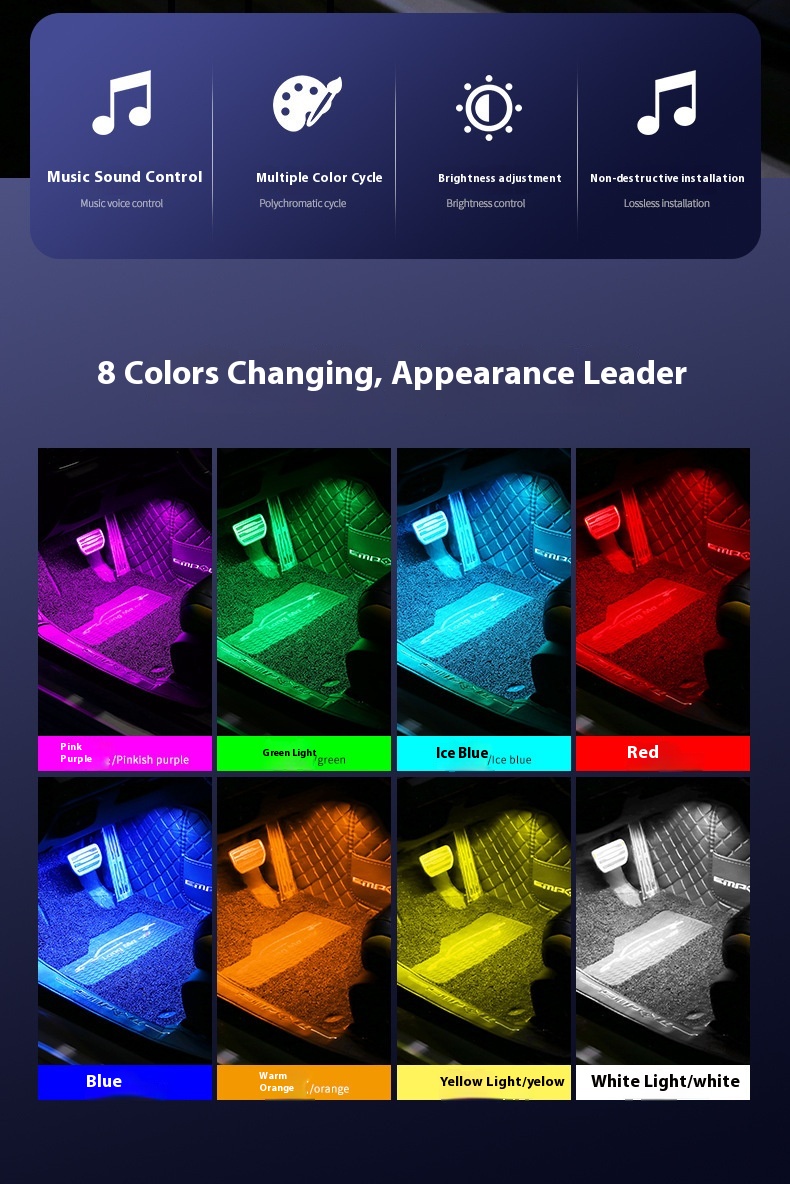 Car Atmosphere Light Car Interior No Modification Eight-Colors Atmosphere Light Car Foot Light